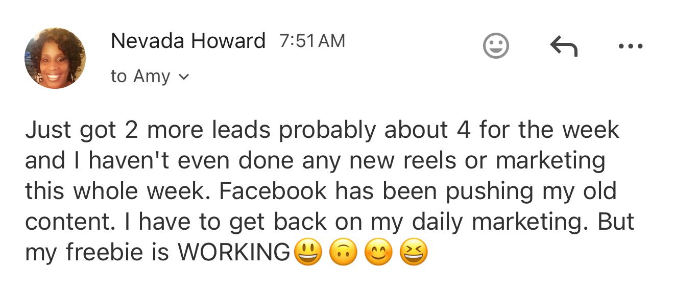 For example, I received this message from Nevada this morning, telling me that she has gotten 4 leads this week from her new freebie funnel, ON